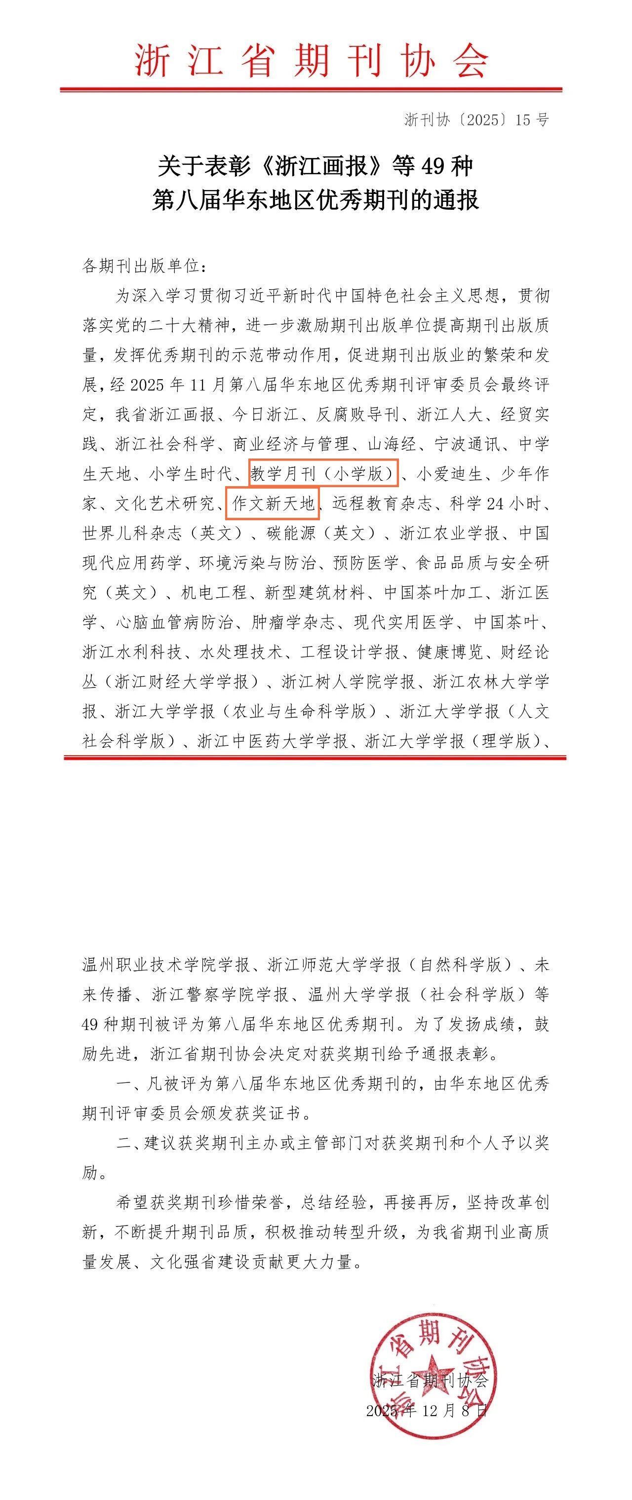 近日,第八届华东地区优秀期刊评选结果正式揭晓,浙江教学月刊社旗下《教学月刊(小学版)》与《作文新天地》双双荣获“第八届华东地区优秀期刊”称号。这是继《教学月刊(小学版)》“本期话题”、《作文新天地》“同题赛场”获评华东地区期刊“优秀栏目”后,两刊再添殊荣。