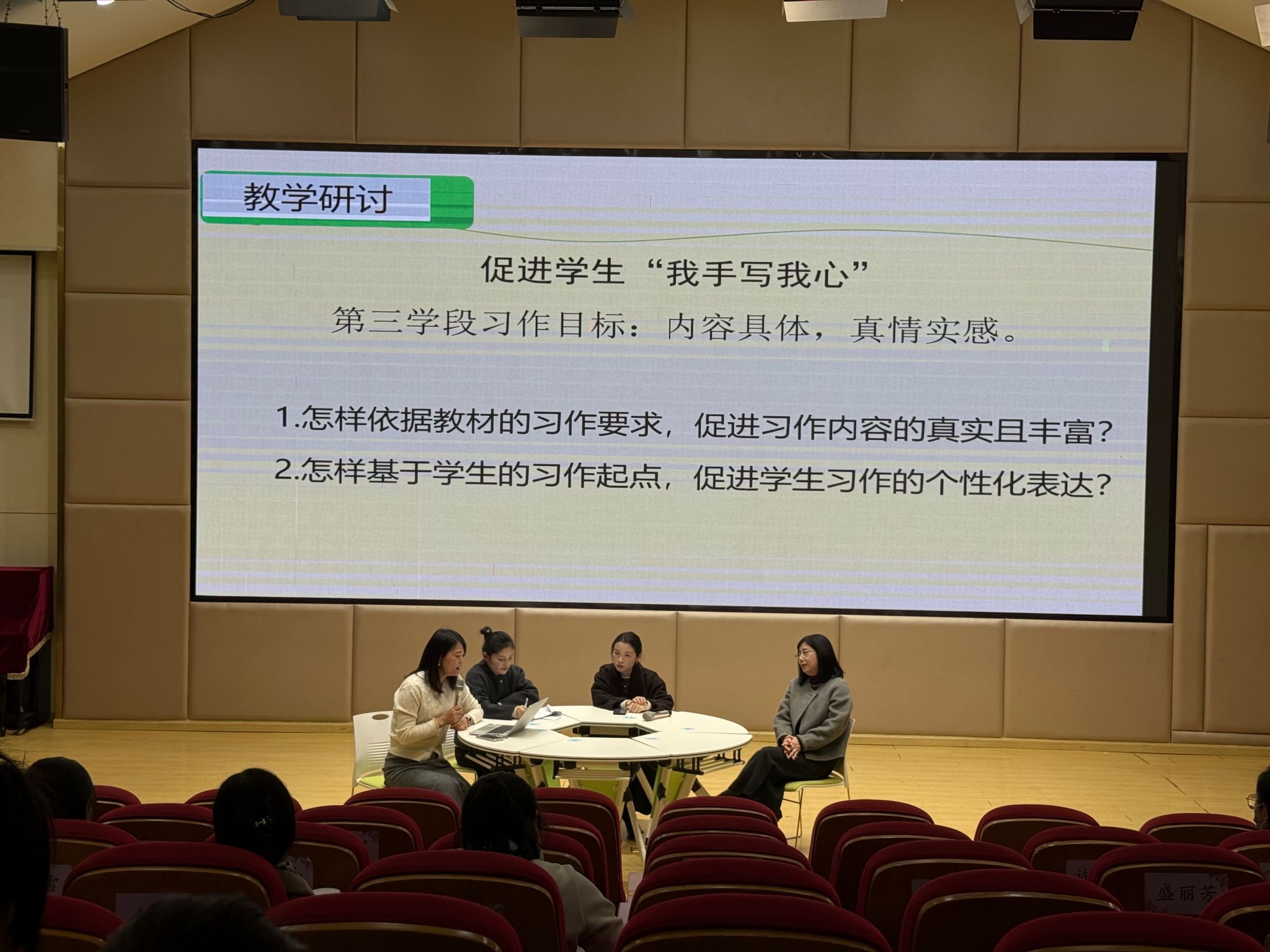 研讨环节,专家们精准点评、倾囊相授。余晓玮名师工作室导师、正高级教师余晓玮聚焦《我的拿手好戏》课堂,以《用好习作教材 用好学生习作》为题开展专题指导。她指出,习作教学需强化生活联结与思维表达的融合,教师要引导学生选择适配的表达方法,理清“动作描写如何体现拿手”的核心逻辑,真正实现个性化表达。