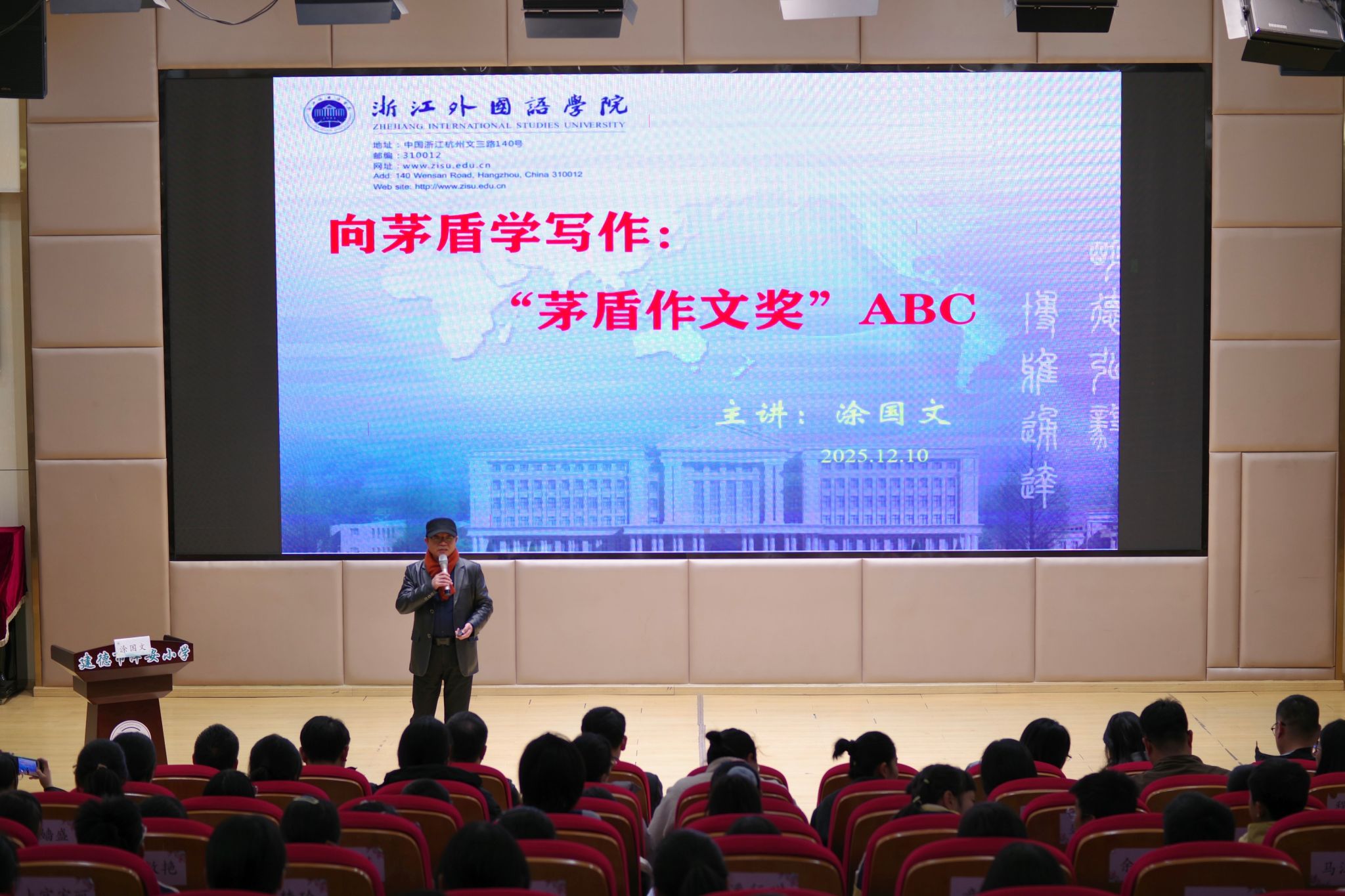 浙江教学月刊社《作文新天地》执行主编涂国文,面向学生群体带来了一场精彩的专题讲座。他以第二届“茅盾作文奖”征文主题“镜”为切入点,围绕《向茅盾学写作:“茅盾作文奖”ABC》展开分享,深入剖析文学性征文的创作逻辑,揭秘“出奇制胜”的写作技巧,分享了“六大自由”的创作理念,为同学们送上了兼具实用性与创新性的写作锦囊,点燃了大家的文学创作热情。