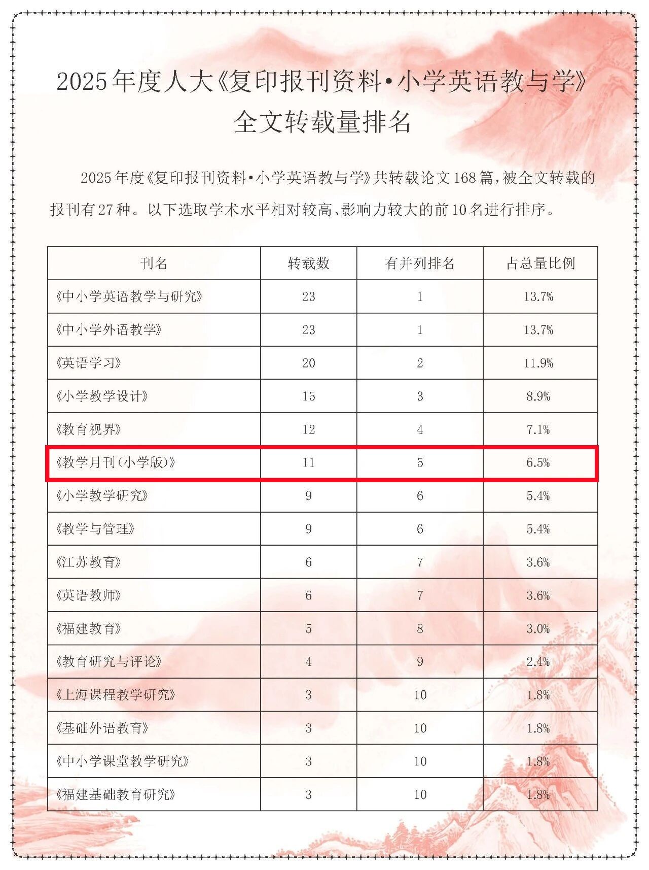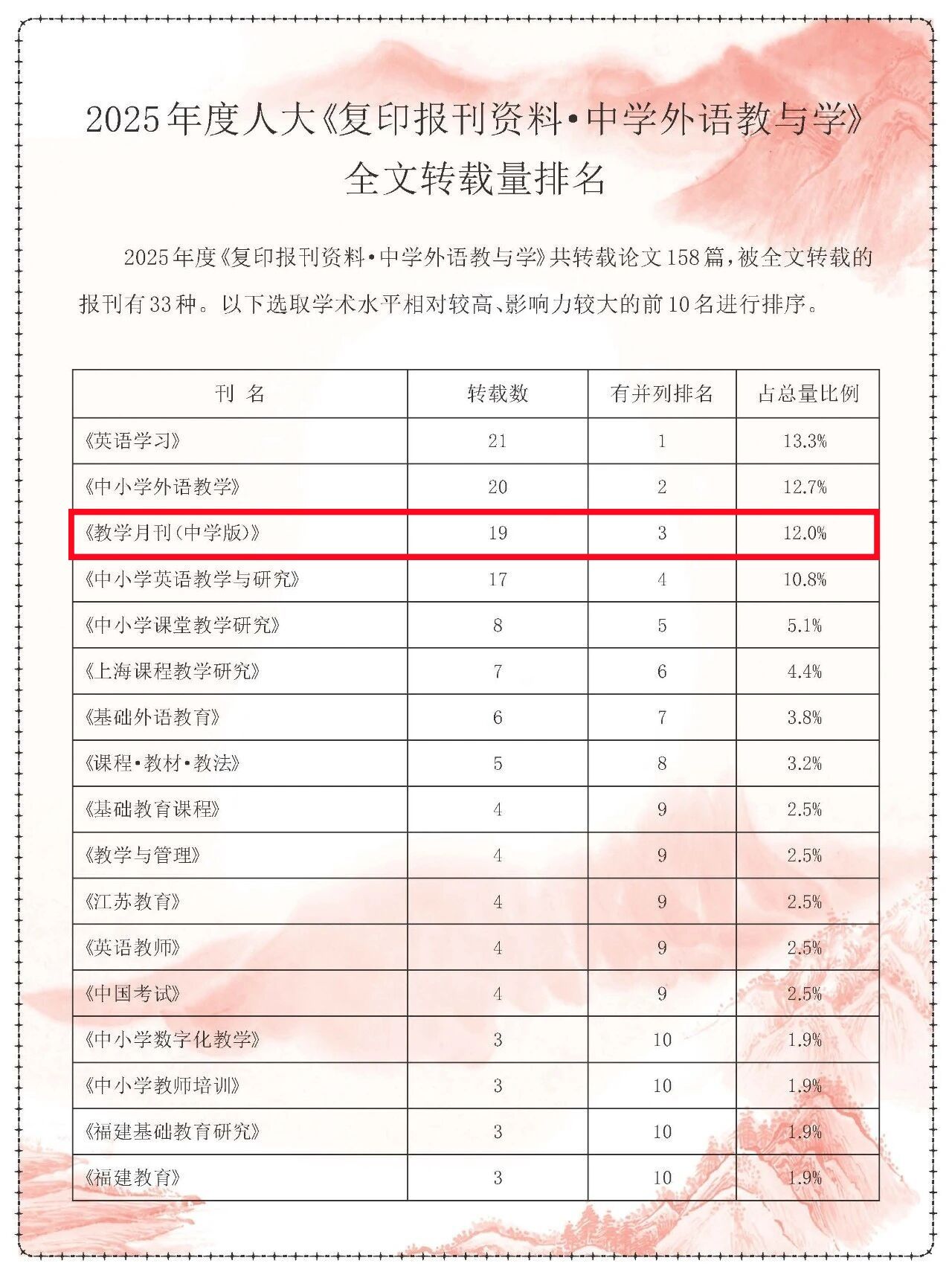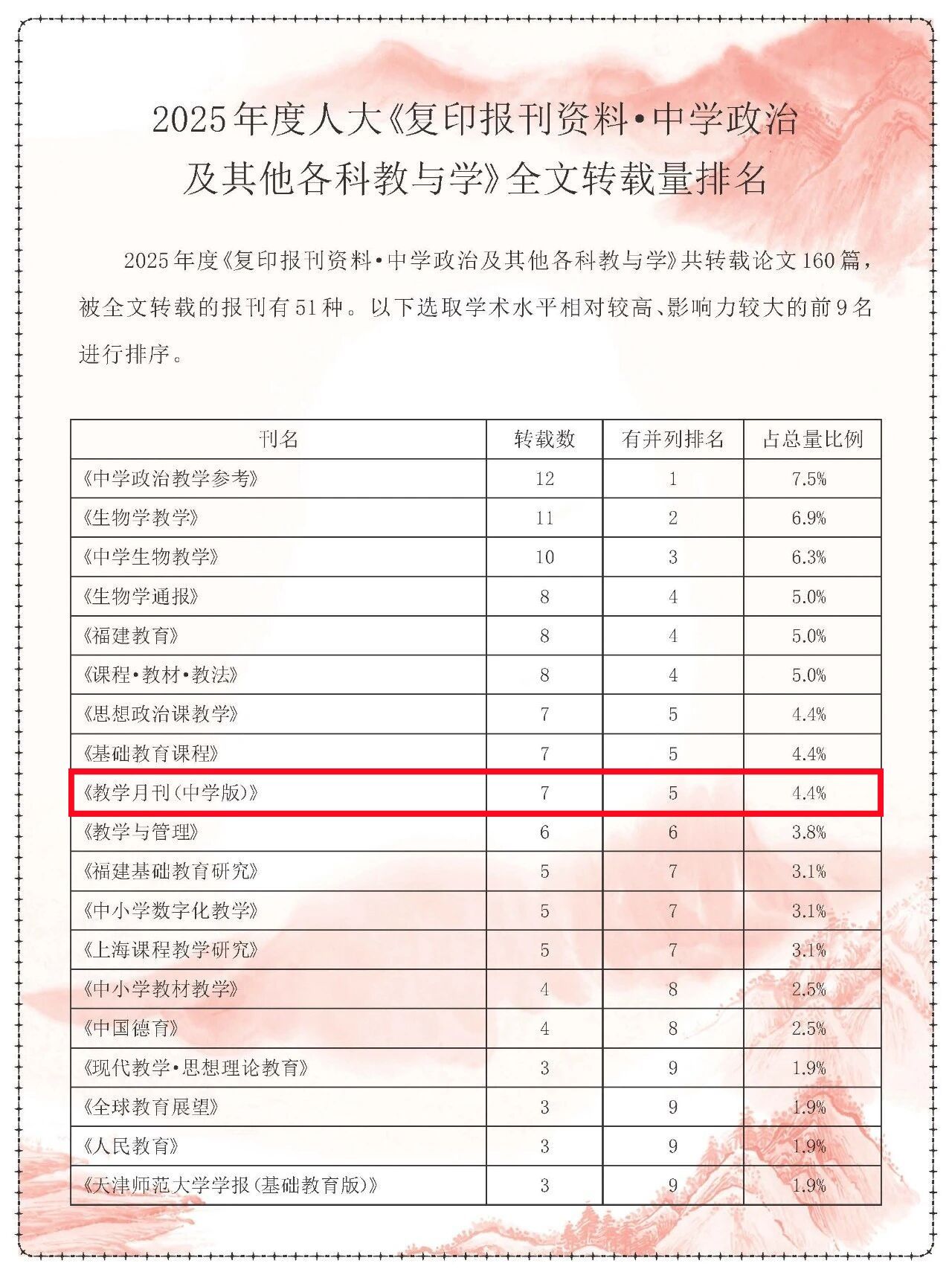 近日,浙江教学月刊社旗下刊物接连迎来喜讯:《教学月刊(中学版)》《教学月刊(小学版)》在2025年度人大“复印报刊资料”全文转载基础教育类排名中喜获佳绩,多学科跻身全国前列;同时,《教学月刊(小学版)》(数学)在维普《中文科技期刊数据库》相关评选中,荣获“2025年度学术影响力进步期刊”。两大权威平台的肯定,充分彰显了教学月刊社的办刊品质与行业影响力。