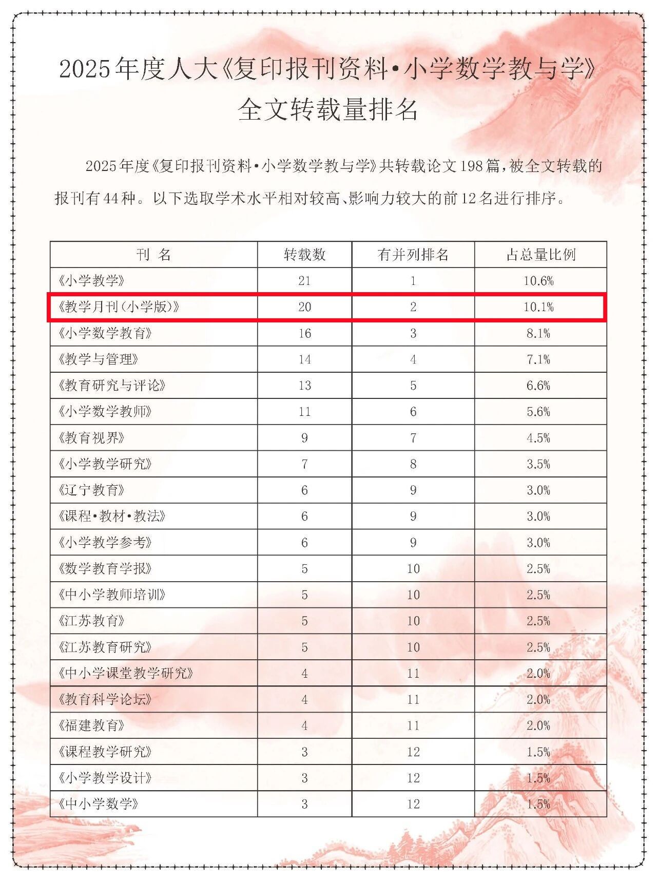 在人大“复印报刊资料”全文转载基础教育类16个学科TOP榜中,两刊合计12个学科强势上榜,其中7个学科跻身全国前5,核心竞争力与综合实力凸显。具体来看,小学数学、素质教育转载量位居全国第二;中学外语、小学语文位列第三;中学化学排名跃居第四;小学英语、中学政治及其他各科均跻身全国第五。此外,中学物理、高中语文、高中数学、中学历史与地理、初中语文等学科也成功入榜,覆盖基础教育阶段多个核心学科,展现了刊物内容的全面性与专业性。