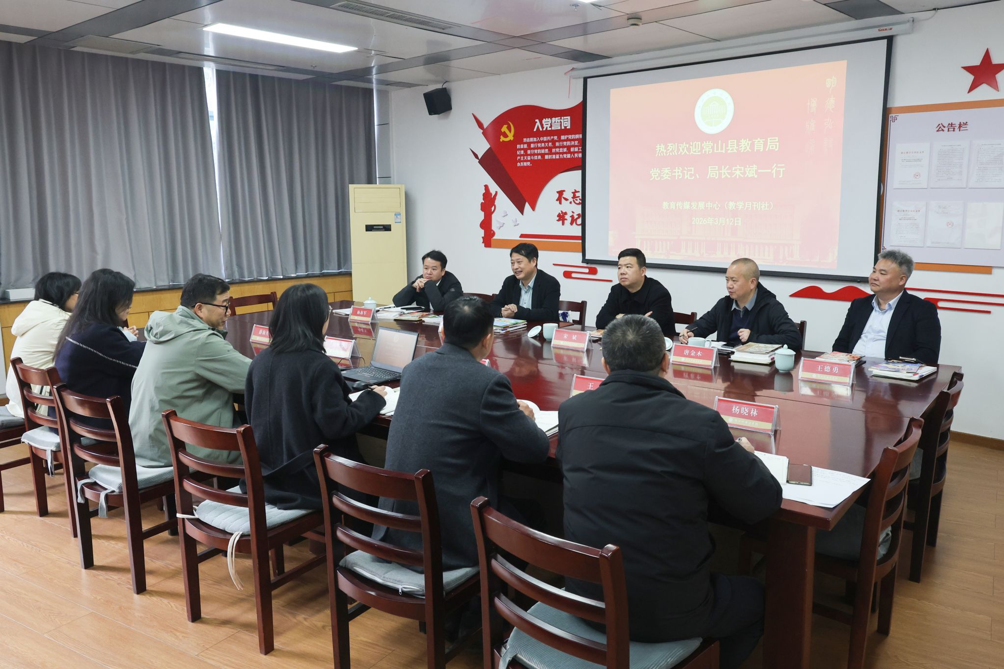 3月12日,常山县教育局党委书记、局长宋斌一行来中心调研交流。教育传媒发展中心主任、直属党支部书记谢雅琴,中心副主任薛海丹、王彭,省督学陈永华编审,以及常山县教育局党委副书记、副局长唐金木,党委委员季志辉、王德勇,办公室主任杨海军等出席座谈会。